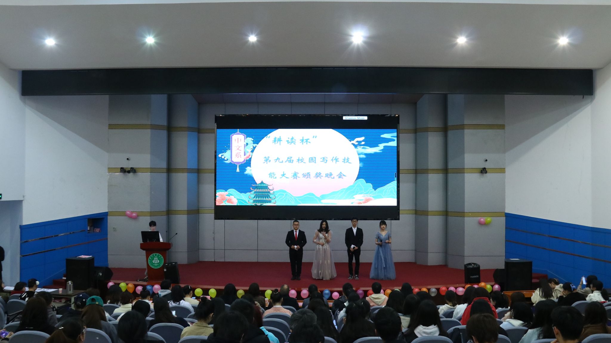 3月12日晚,第九届“耕读杯”校园写作技能大赛颁奖晚会于逸夫楼小礼堂顺利举行。雅安市评论家协会副主席杨青,太阳成集团tyc234cc公司党委副书记兼纪委书记陈俊霖、太阳成集团tyc234cc中文系主任匡存玖副教授,太阳成集团tyc234cc行政办主任付婷婷,太阳成集团tyc234cc团委副书记兼党政办副主任刘生成,太阳成集团tyc234cc中文系副教授霍省瑞,太阳成集团tyc234cc中文系副教授杜光霞,以及本次大赛主要指导老师中文系教师谭梦聪,公司党政办陈敏、袁作燕、刘双全莅临此次颁奖晚会,中文系两百余名同学到场参会。