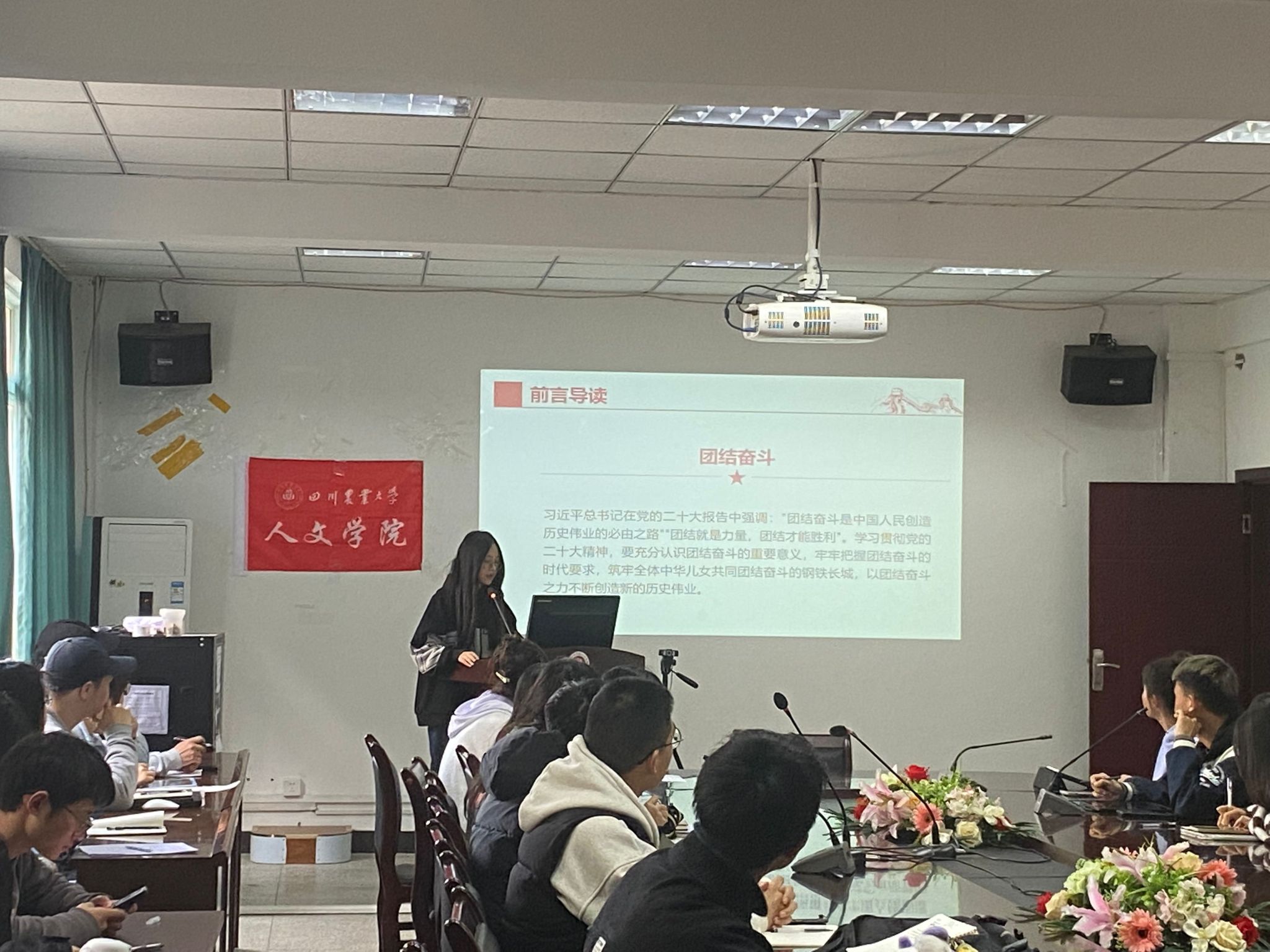 刘梦瑶围绕团结奋斗是中国人民创造历史伟业的必由之路、团结奋斗是党领导人民奋进新征程的必然要求、广泛汇聚团结奋斗的磅礴伟力三个方面展开讲解。她表示:学习贯彻党的二十大精神,要充分认识团结奋斗的重要意义,牢牢把握团结奋斗的时代要求,筑牢全体中华儿女共同团结奋斗的钢铁长城,以团结奋斗之力不断创造新的历史伟业。