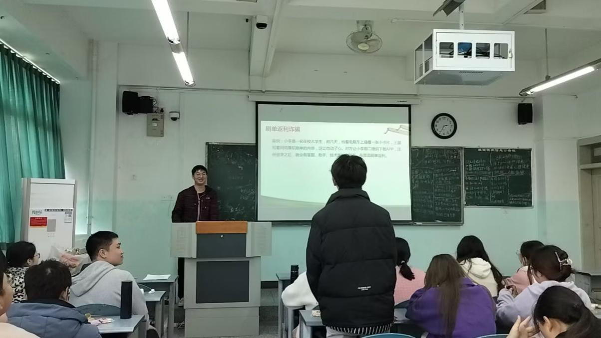 此次活动以反诈短片《如果人生可以重来》引入主题。随后,在“诈骗就在你我身边”环节中,王显仁、李雪莹、赵师恒三位同学住分享了亲身经历过的诈骗事件。活动过程中主持人金尔壮介绍了刷单返利诈骗、冒充电商物流客服诈骗、虚假中奖诈骗以及冒充熟人诈骗这四种常见的电信诈骗方式,并结合实际案例,提倡同学们以“情景带入”的方式,分享自己在相应情况下的处理方法。