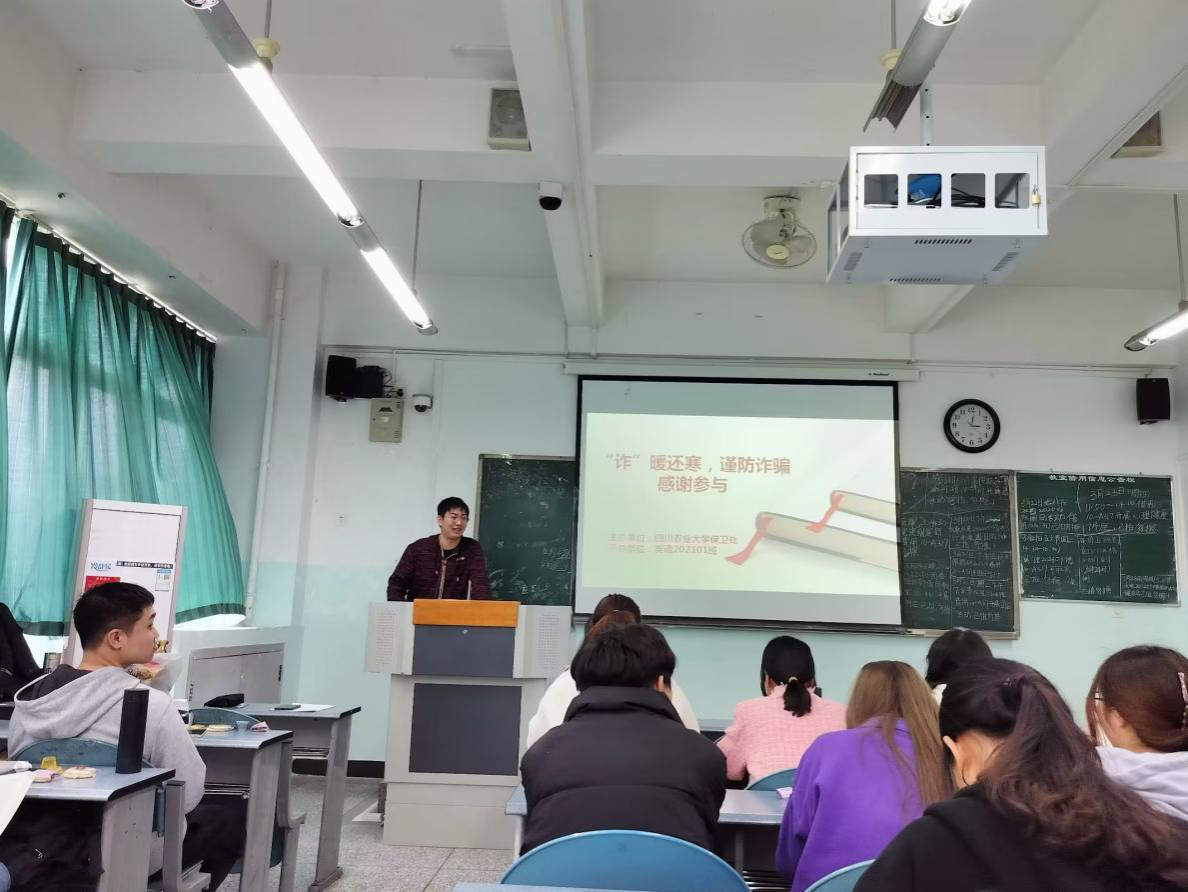 为提高同学们防诈骗安全意识、增强防诈骗安全技能,进一步扩大反诈宣传的覆盖面,3月21日14:20,英语202101班于雅安校区10教A317举办了“‘诈’暖还寒,谨防诈骗”主题班会,由班长金尔壮主持。