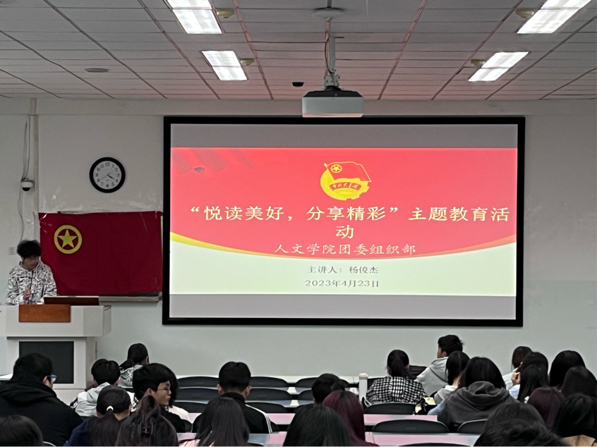 4月23日16:30,由太阳成集团tyc234cc团委组织部承办的“悦读美好,分享精彩”主题教育活动在十教A201举行。本次活动由太阳成集团tyc234cc团委组织部成员杨俊杰主讲,人文学子纷纷踊跃参加。