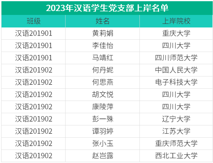2023年,汉语员工党支部在册人数22人,汉语言文学专业考研保研录取人数15人,其中党员录取人数11人,党员上岸率50%,党员占上岸人数比例73.3%,相比去年提高了13.3%,多名毕业生被中国人民大学、四川大学、电子科技大学、重庆大学等知名高校录取。