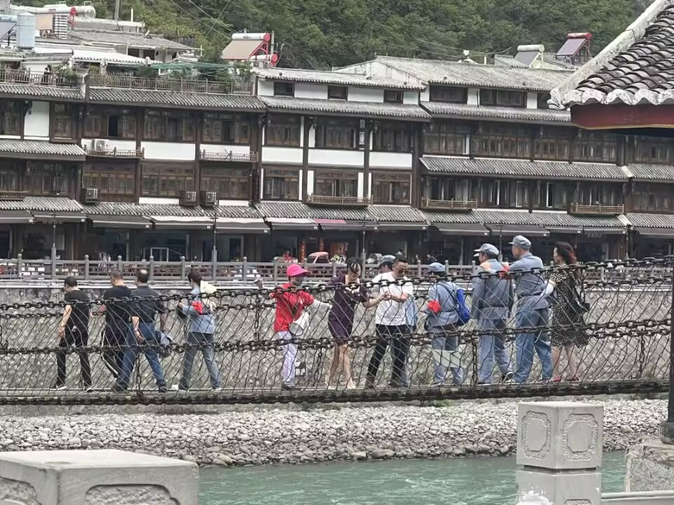 团队成员们相互搀扶着,走到了桥西岸。在西桥头,成员们被一块牌匾吸引,驻足良久,牌匾上记录的正是红军飞夺泸定桥的英勇事迹。在看完牌匾返回的路上,团队成员们渐渐迈开了步伐,只花了来时的一半时间便回到了东岸。