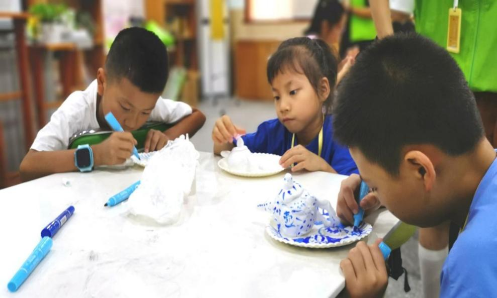 课堂中,主讲老师宋华丽以图文形式展现了茶壶的基本形态,并引导小朋友们运用黏土制作简易茶壶。在志愿者老师的协助下,小朋友们制作了形态各异的“茶壶”,并涂上了各式花纹。最后,小朋友们都拥有了自己的“茶壶”。
