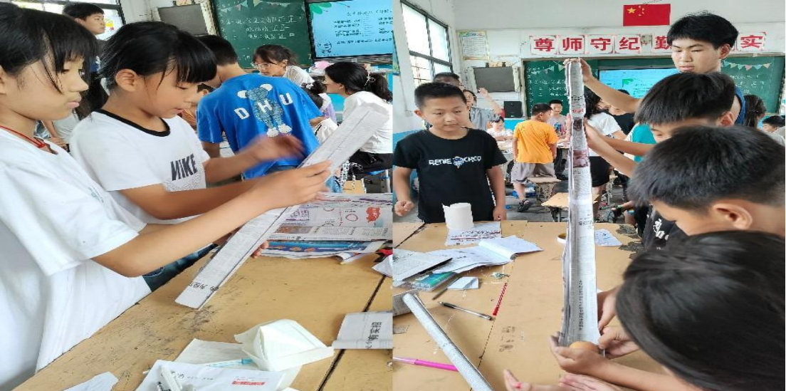 蛋哥游乐场环节,小朋友们在小组内利用报纸、双面胶、胶棒等工具合作完成了滑滑梯,他们将滑梯连接处用胶布加牢,防止蛋哥不小心摔出而破碎,再将蛋哥小心翼翼地放在滑滑梯开口处。