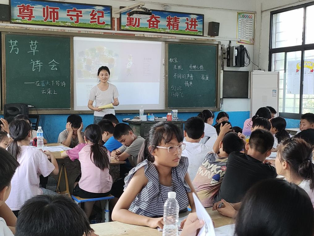 7月26日,青风支教团在河南省商丘市睢县平岗镇郭八村卢洼小学教室里举行了一次特殊的聚会——芳草诗会。小朋友们观察、倾听、思考周围的整个世界,通过现代诗歌抒发内心的感触与情感,芳草诗会兴趣课程的开展取得了良好的反馈。