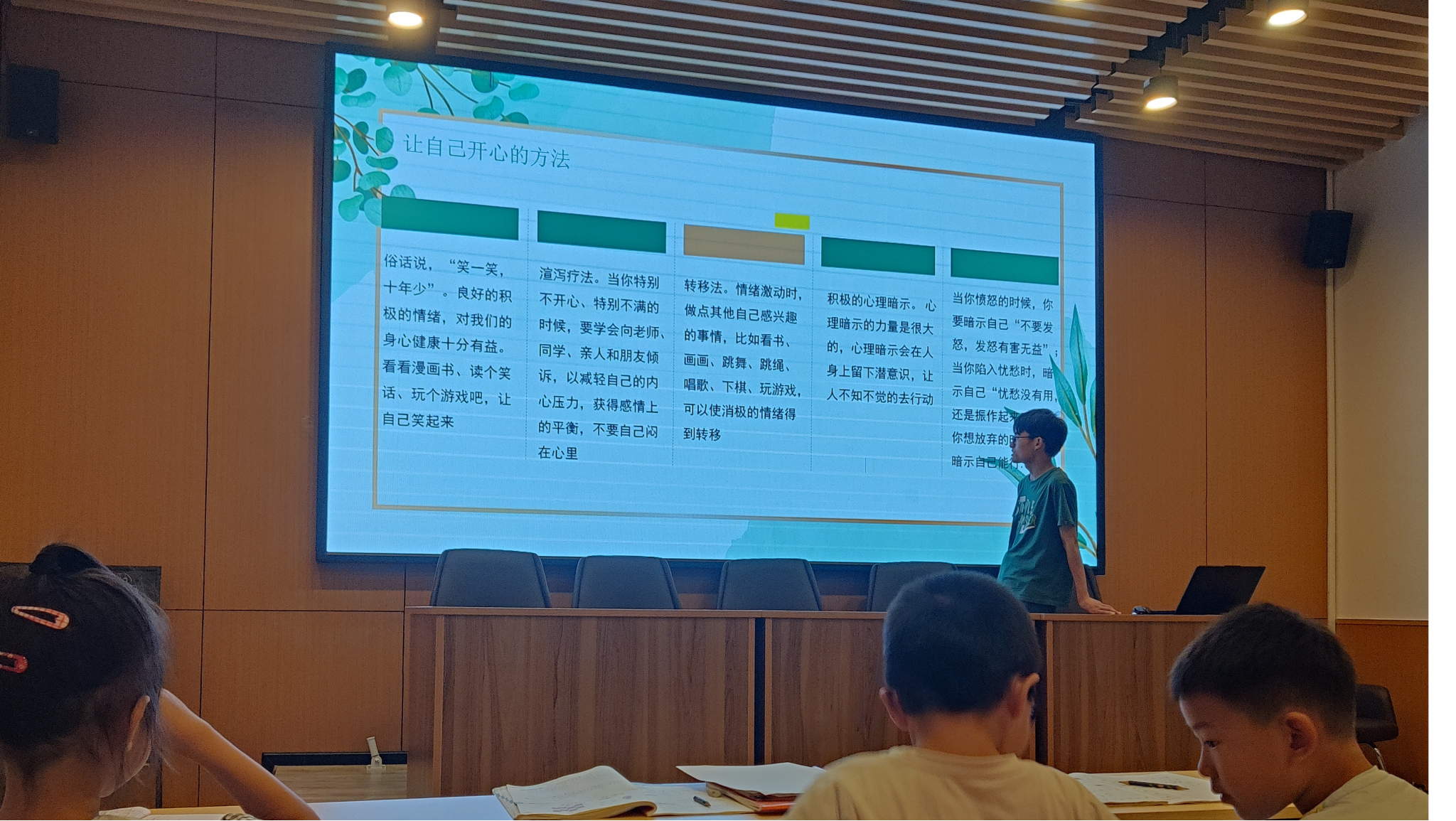 当天上午,志愿者们来到顺路社区,通过成语接龙等破冰小游戏与社区小朋友初步熟悉。随后,主持人陈伟通过几张有趣的心理学图片引入内容,与小朋友们进行了一场视觉游戏。以经典的“米勒·莱尔幻觉”图为例,主讲人陈伟指出看图角度影响看图所获信息的观点。接下来,其余志愿者通过情景剧表演的形式演绎经典故事——卖伞与卖鞋,与小朋友们进行互动,提出面对考试失败的四种态度,并邀请四名同学进行角色扮演,带领大家一同探讨四种态度分别导致的结果。讲座的最后,主讲人介绍了五种排解情绪的方法,有利于保持良好心态,做情绪的主人,预防心理健康问题。
