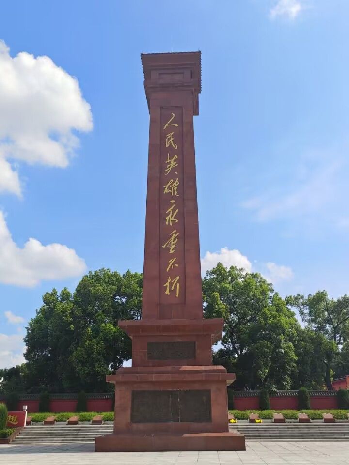 初入陵园,映入眼帘的是层层阶梯,阶梯两侧是革命先烈的浮雕,高大的树木在两侧守护着他们。来到广场上,中央矗立着一座高大的纪念碑,碑上镌刻着“人民英雄永垂不朽”八个金色大字。碑座后方整齐地排列着英雄的墓碑,碑座右侧是从1921年至今的眉山烈士名录。在纪念广场上,小队成员默哀一分钟,并三鞠躬表达对先烈的深切悼念之情。