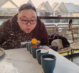 浮力乒乓球,顾名思义,就是要吹动乒乓球,使其依次穿越5个盛满水的杯子,这是一项需要精准控制呼气力度和方向的挑战。水花飞溅,笑声回荡,两相交织成一幅欢快的画卷。