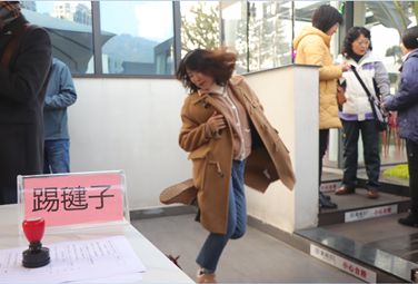第二项游戏是踢毽子,活动现场充满了欢声笑语,挑战者们神情专注,尽情展示自己的灵活身手。毽子在空中飞舞,宛如彩色的蝴蝶,勾勒出一道道美丽的弧线。