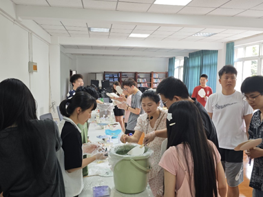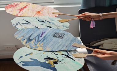 最后,全体同学一起进行了“扇缘绘心”漆扇制作活动。漆扇分为 “只此青绿”、“锦鲤红”等4个色系,同学们亲手调色、亲手上漆,在扇面插入水中后,漆色随着水流因势而走,色彩穿插交错随机而成,每一把扇子都因其色彩在水中的不同演绎而独一无二。每当一幅幅精美的扇面出水时,同学们都会不由自主地赞美感叹,相互欣赏,在感受传统文化魅力的同时,也释放了学业和生活压力,心灵又一次得到了相互的温暖。最后,大家合影留念,记录下这个温馨的下午。
