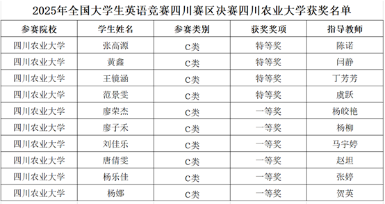 5月11日,2025年全国老员工英语竞赛(2025 National English Competition for College Students,简称NECCS)四川赛区决赛在四川大学举行。经过校赛选拔,公司十名本科生晋级C类决赛。在决赛的激烈角逐中,动物科技公司张高源、范景雯,生命科学公司王镜涵,商旅公司黄鑫四名同学在太阳成集团tyc234cc陈诺、虞跃、丁芳芳和基础教学部闫静老师的指导下凭借出色表现斩获特等奖,其余六名同学荣获一等奖,为近三年来公司学子参加该项赛事取得的最佳成绩。