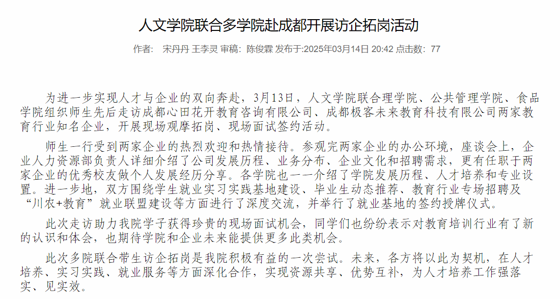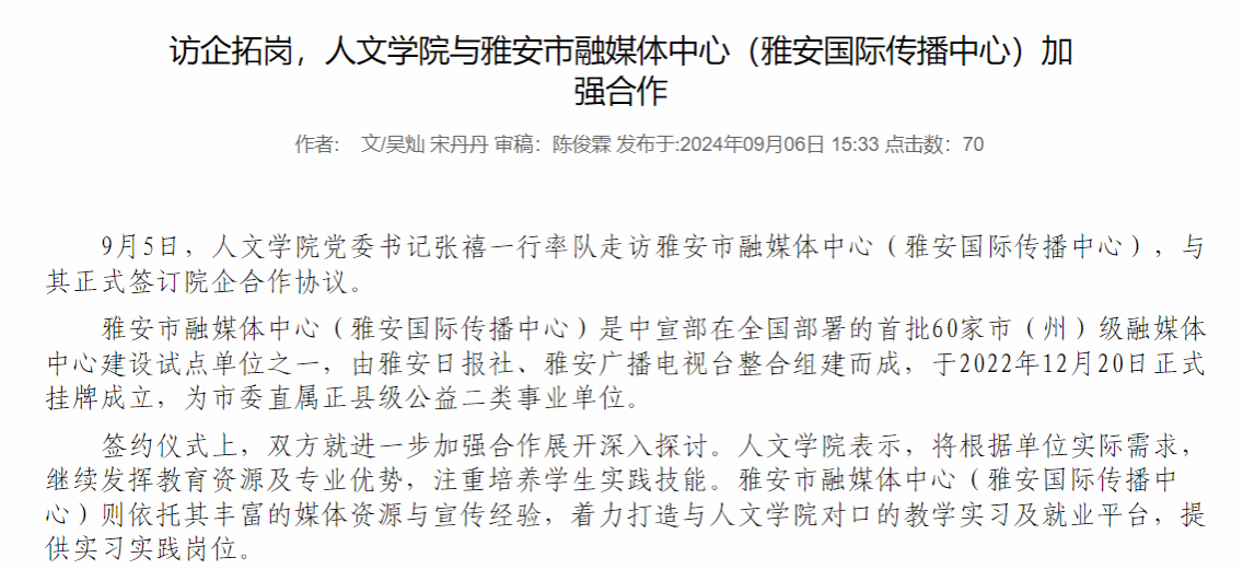 2023年在规定时间内提交完备重点群体就业信息台账;2024年持续完善重点群体帮扶机制;2025年成功提交含《全国网签系统困难群体毕业生名单》《2025届毕业生就业创业帮扶情况记录表》在内的完备就业信息台账,三年如一日地细致,为重点群体学子铺就就业坦途。2023年走访优质企业并签订9家就业创业实习实践基地;2024年11月-2025年6月,与四川天成玻璃、上海译国译民翻译服务等11家企业签订基地;2025年实地走访雅安市融媒体中心、四川现代艺术公司等12家企业签订院企合作协议,从“本地合作”到“全省联动”,就业市场版图持续扩大。