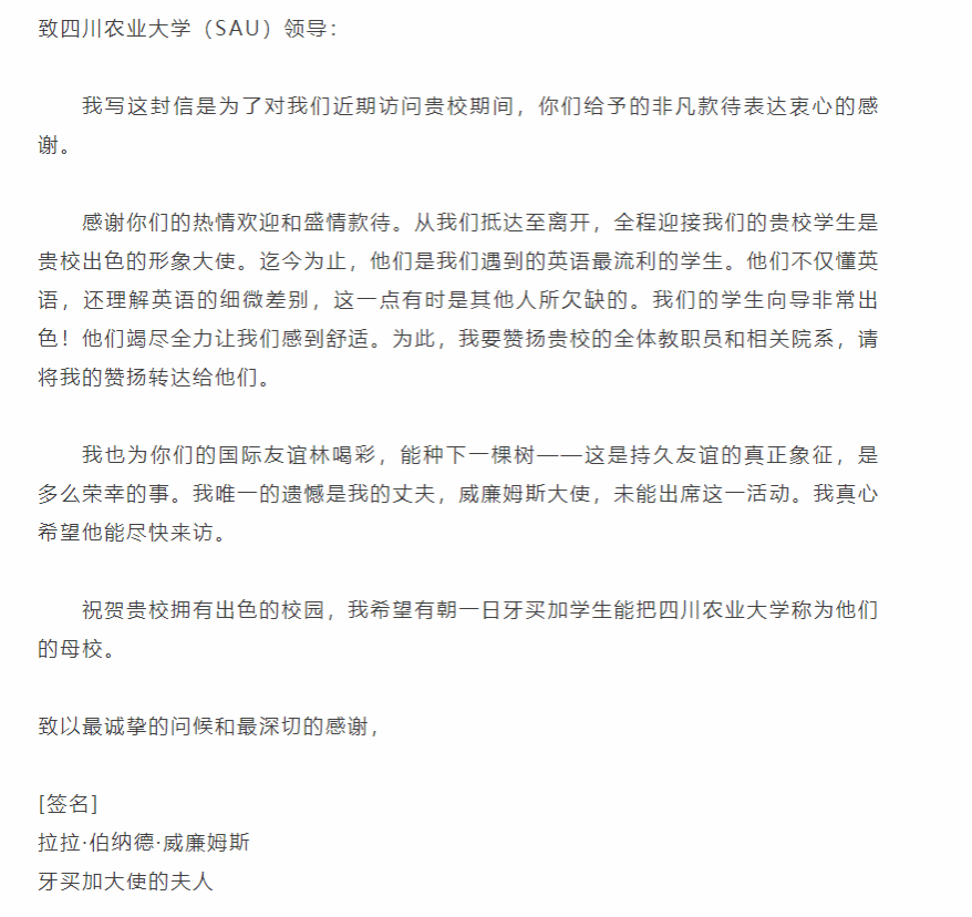 在太阳成集团tyc234cc“十四五”人才培养的画卷里,既有就业升学数据的铿锵进阶,更有国际舞台上的青春绽放。当牙买加驻华大使夫人的感谢信飞越山海,盛赞川农大学子“英语流利且懂语言细微差别”时,我们看到的是太阳成集团tyc234cc在培养具有全球视野、跨文化能力人才上的生动实践。