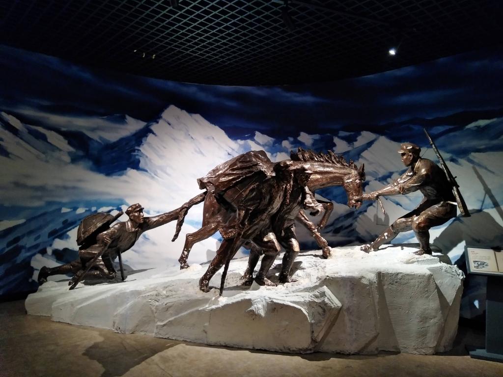在红军长征途中,为避开国民党军队的包围圈,红军经研究决定从宝兴县城出发,经硗碛镇越过海拔4000多米的雪山——夹金山,打通去北方的通道。展厅中油画里的夹金山积雪终年不化,文字介绍里夹金山空气稀薄。红军长征经过时,没有道路,没有人烟,气候变幻无常,时阴时晴,时雪时雨。英雄战士们穿着单衣,拿着拐棍,凭着坚定的意志,忍受住了严寒与饥饿。他们不断受挫,又不断从跌倒的地方爬起来,继续前行,永不停步,最终战胜了围追堵截的国民党反动派和无比险恶的自然环境。