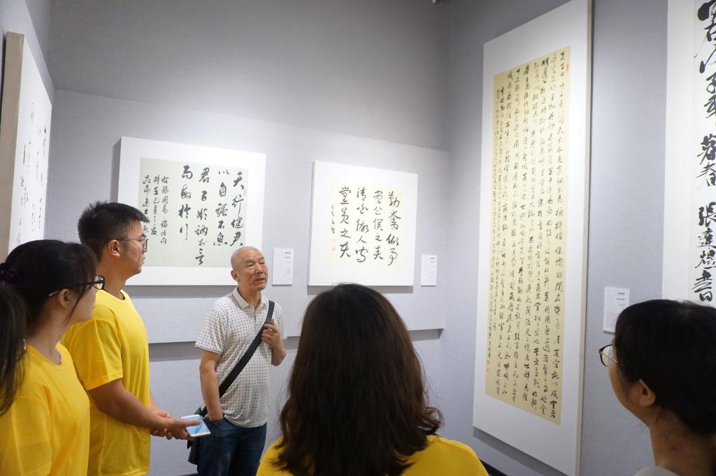 随后,老师带同学前往“修身”主题的展区,胡老师首先介绍的是此次与团队同行的书法家叶思源老师的作品,写的是唐代文学家韩愈的一篇古文《进学解》。以颜字为基调,有颜字的开阔开展,加入李富积的行书,取其章法,是二者的结合,给人一种正大、正气的感觉,大小布局错落有致。字行间的罗列与呼应颇见才气,形成了章法上的跳跃。与此同时,叶老师也为团队成员讲述了创作这幅作品时的心路历程,言谈间可知叶老师对作品的要求首先是要能看得懂,其次才是艺术性,他朴实真挚的语言让人感受到这位出身民间却师承大家的书法家对书法的艺术追求与热爱。