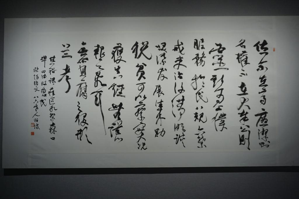 伴随雨声,团队成员在书法家张道刚和叶思源的带领下来到了书苑。还未走进书苑内,便看到讲解员胡春雨在向成员招手,在胡老师的带领下,成员走进了这座墨香浓郁的建筑。胡老师介绍到“修身、齐家、为民”是书苑展厅的主题,以此表现党的十八大以来大力弘扬并实践的廉政精神,书苑的建设初衷就是希望可以用书法承载这种精神并传承下去。进入主厅,胡老师介绍了第一副书法作品——出自欧阳福的《公仆铭》,由中书协会员柏波所书,这份草书大气中不乏精微,放荡中不失收敛,草书和行书、楷书不同,其内容对于没有书法功底的人来说辩识难度大,但是其书法的节奏、笔墨的浓淡变化都能令人感觉不凡,并且这幅作品的内容与表达的感情都与廉政主题紧密结合。