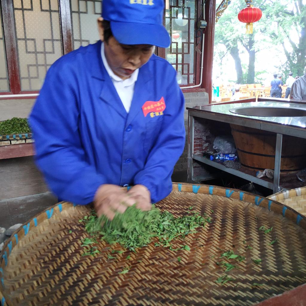 团队继续前行,来到了一个制茶基地,在征得工作人员的同意后,得以近距离观察毛峰茶的制作过程。炒茶师傅将新收的茶叶放入锅中烘炒,告诉队员们“茶要炒三道,一道工序都不能少!”。队员还观察到,在炒完一道茶后,炒茶师傅总要用手使劲地按压茶叶,以更快地去除茶叶中的水分。