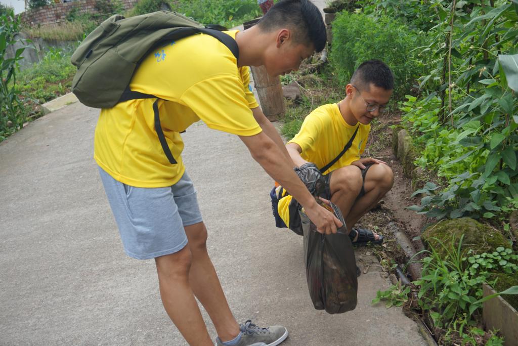 在第一阶段的实践中,绿色精灵队开展的主要活动包括对垃圾进行收集与分类和向当地村民宣传垃圾分类知识。由于葫芦村的村民居住较分散,为了不打扰村民的日常生活,队员们采取在主要道路上拾捡垃圾并挨家挨户宣传垃圾分类知识的形式开展活动。