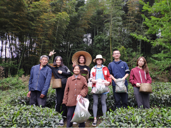 低保户茶农杨永贤一家仅有他和他儿子两人。杨永贤患有听力残疾,年老行动不便,只能做一些轻松劳务活,儿子是一家人的主要劳动支柱。因为儿子工作,每年茶收只能靠他周末回家抢收,他们家是此次活动的重点帮扶对象。杨永贤热情的迎接了志愿者们,短暂交流与介绍后带领志愿者们来到了他所种植的茶田,为志愿们讲解采茶的技艺与要领。同学们按照老人的指导认真学习,很快就投入到采茶中。
