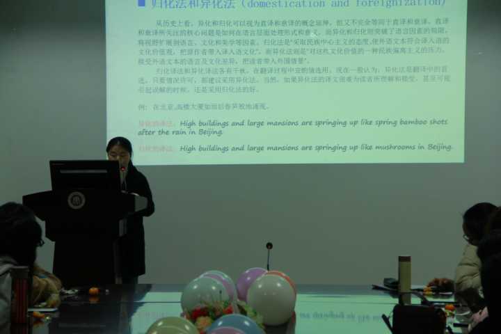 在此之后,该小组介绍了一些常用的翻译方法,并通过举例的方法,与大家一起探讨关于走婚文化的负载词,比如“佐佐嘎”、“生死门”、“阿夏”等的英译。小组也邀请了一些有翻译想法的同学分享意见,指导老师董梅也对其中的翻译词做了讲解和评价,使同学们获益匪浅。