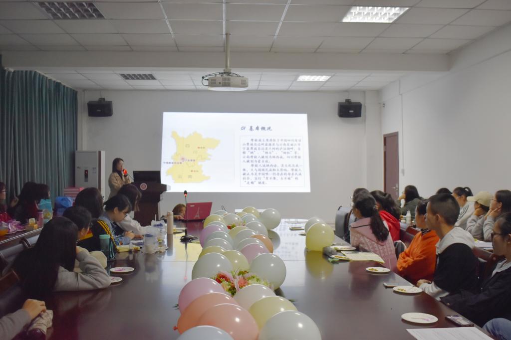 紧接着“摩梭走婚文化译介”科研兴趣小组大致介绍了居住于四川省盐源县与云南省宁蒗县泸沽湖畔的摩梭族人。本次分享涉及到摩梭族的文化背景及风土人情。工作人员也在现场分发了摩梭族的特色美食,摩梭的美味受到到场同学的一致好评。