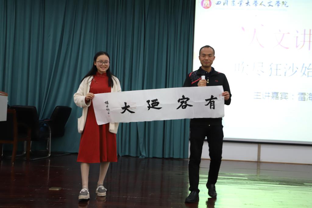 在提问环节,同学们踊跃提问,雷海为也耐心地一一解答。其中来自英语201803的罗娅熙向雷海为分享了自己热爱诗词但无缘梦想的经历,雷海为也送上了“长风破浪会有时,直挂云帆济沧海”这句诗来激励她。而来自汉语201702的杨林舒在提问后向雷海为送上了自己所写的一幅字,在场所有人都被这份特别的礼物所感动。