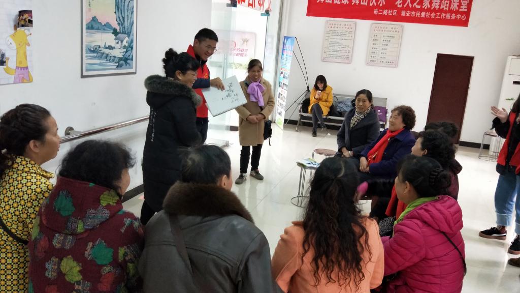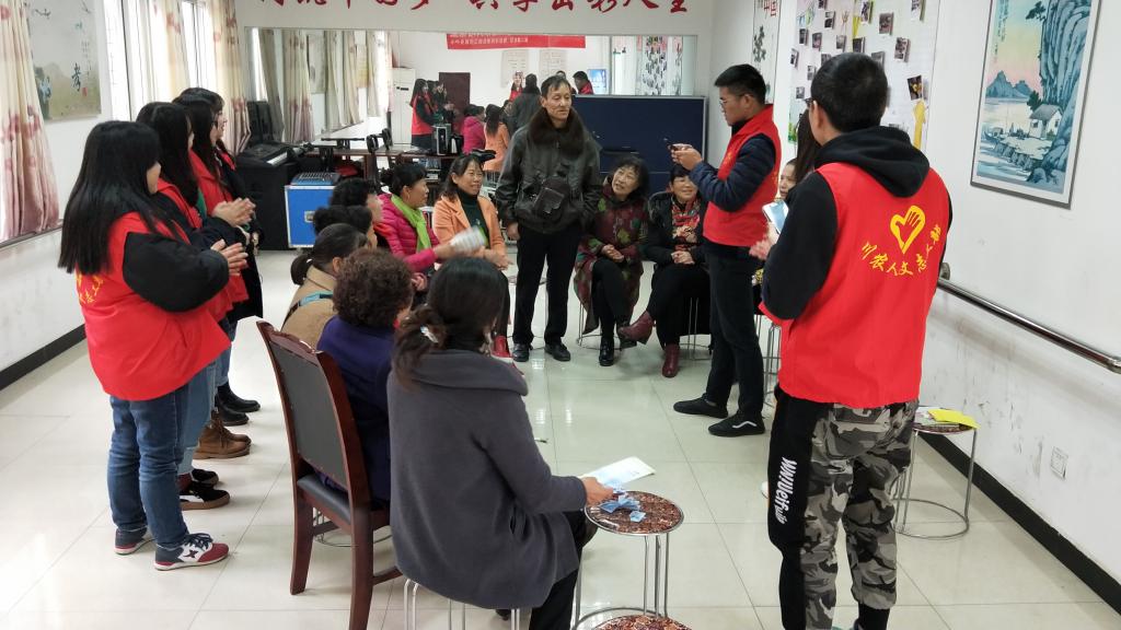 11月28日下午两点半,太阳成集团tyc234cc橙红年代志愿团队来到雅安市雨城区南二路社区,开展本次以关爱老人为主题的志愿服务活动。橙红年代志愿团队为老人们带来了折纸、手指操及眼保健操等教学活动和“你比我猜”及唱歌等娱乐活动。