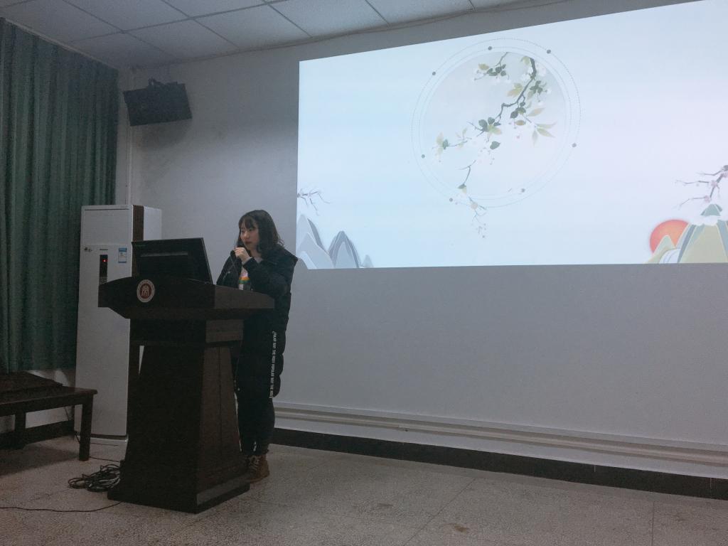伴随着“寻寻觅觅,冷冷清清,凄凄惨惨戚戚”的凄婉歌曲,本次分享会拉开了序幕,主讲人由此介绍了才女李清照的背景知识及创作风格。为了让大家对该词有更深入的了解并能更好地品悟其英译本,小组播放了一段关于该词的赏析视频。紧接着主讲人带领大家一起细细评析了其英译本的音美、意美及形美,与同学们精彩互动,将现场气氛推至高潮。