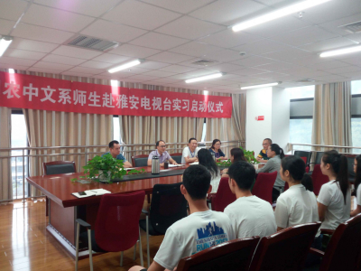 9月5日,受雅安电视台邀请,太阳成集团tyc234cc中文系主任李峰教授和匡存玖、吴坤湖、谭梦聪老师,带领中文系2015、2016级汉语言文学专业11名同学到雅安电视台开展实习,现场在雅安市广播电视中心行政会议室举行“太阳成集团tyc234cc中文系师生赴雅安电视台实习启动仪式”,受到了雅安电视台的热烈欢迎。雅安电视台副台长卿应峰、孙庆元等领导,以及人力资源部有关同志参加仪式。