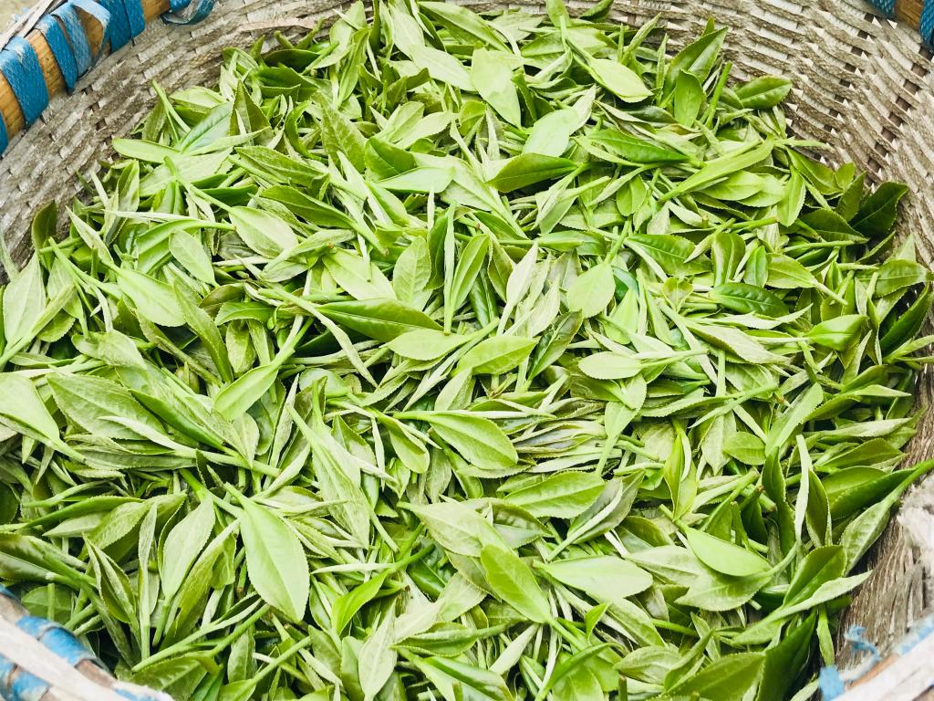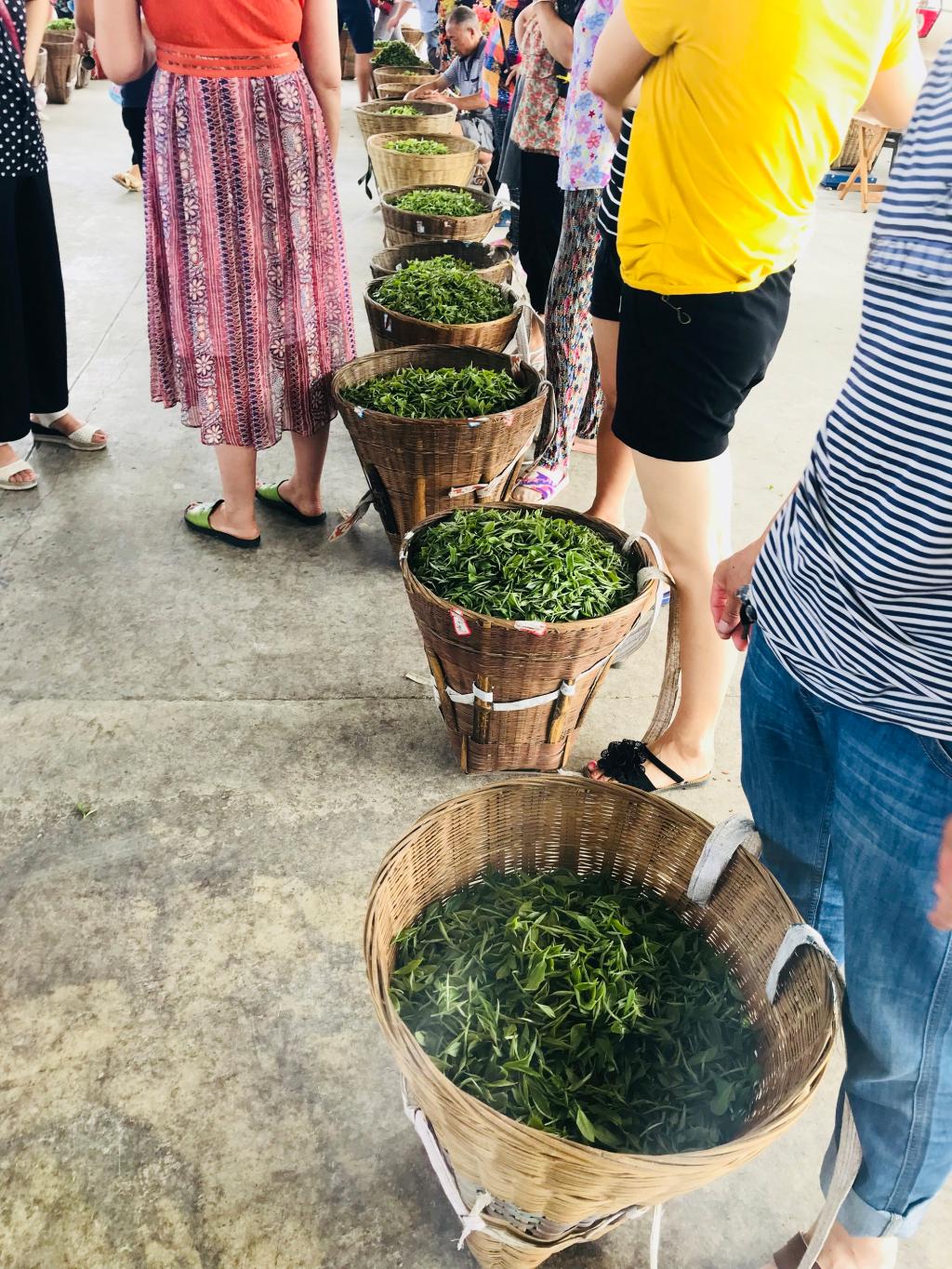 实践团队首先来到黑竹茶叶市场,这里鲜叶交易正热火朝天地进行着,市场的工作人员向团队成员简单介绍了鲜叶的交易情况。团队成员了解到,鲜叶的交易主要集中在春夏两季,收购鲜叶的茶商大部分是来自名山区的大型茶叶加工厂。随后在对茶农的采访中,一位茶农告诉团队成员,夏季的鲜叶比春季的鲜叶价格低很多,春季的鲜叶品质更高,龙井和毛峰的原材料就是春天的鲜叶。