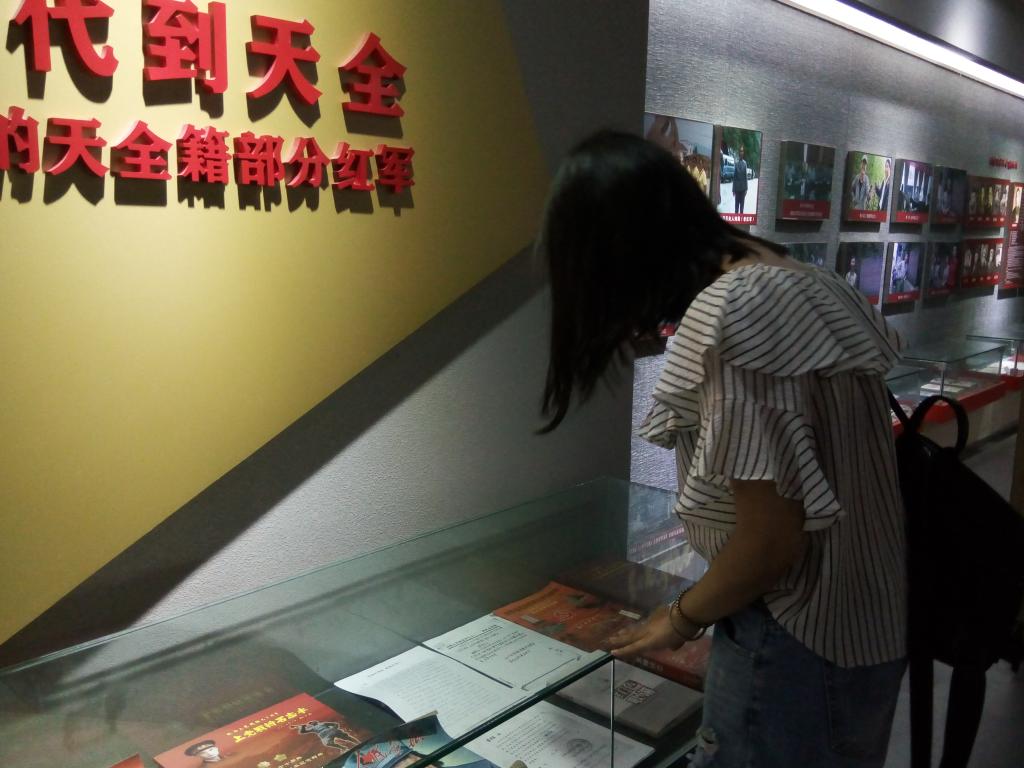 上午十点左右,团队到达目的地。经调查得知,馆内不仅有300余幅红军长征征途图片,还有500余件红军当年所用的战斗、生产、生活实物。在参观过程中,队员们近距离的观察着这些带着岁月气息的革命痕迹:战士们曾带上战场的武器,刻录着浴血奋战的红军战士名字的名单,记载于册的英勇事迹。此时此刻,全队成员仿佛成为了历史事件的参与者:为红军成功飞夺泸定桥而激动万分,为红九军勇夺天全而庆幸非常,为二郎山下毛泽东和周恩来的运筹帷幄而赞叹不已……