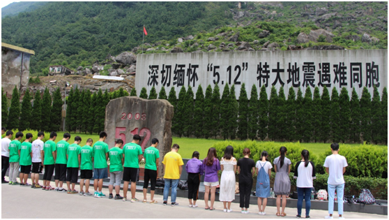 车很快来到目的地,看着早已看不出昔日繁华的老县城,队友们纷纷沉默,沿着大道走过,曾经的邮局、公安局等都早已倾斜,只能用钢架支撑着,残败的景象仿佛在向世人诉说着十年前的悲痛。接着一行人来到了5.12地震遇难公墓前,团队与同行的西安电子科技大学社会实践团队一起举行了默哀仪式,表达对遇难者的悼念之情。参观完地震遗址返回途中,两行人遇到了中国地质大学(北京)的实践团队,三个团队一起交流了参观感想。中国地质大学(北京)实践团队的队长邓惠丹表示:“我们团队的大多数成员都不是四川的同学,当年地震的时候,也只是通过新闻报道了解灾区的情况,而今天参观了地震遗址,真切的体会到了地震给北川人民所带来的巨大灾难,以及我们党和国家在抗震救灾、灾后重建等方面的积极性的行动。”当初温家宝总理在灾后第一时间来到现场,不放弃一丝希望,尽最大努力营救一切生命,也正是国家的全力帮助和人民的共同努力,才使北川逐渐恢复生机。