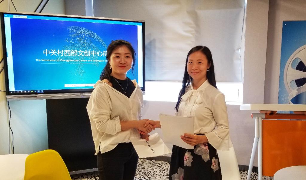 两院教师又到相距不远的中关村西部文创中心,与其负责人舒苏进行了交流,并分别签订院企合作框架协议。中关村西部文创中心是中关村海淀创业园和武侯区政府联合打造的文创类孵化载体,主要从事文创“项目-企业-产业”的孵化。老员工创业团队指导是其工作的重要部分,也是此次院企对接的着力点,双方就未来老员工创新创业方面的合作进行了探讨并达成共识。
