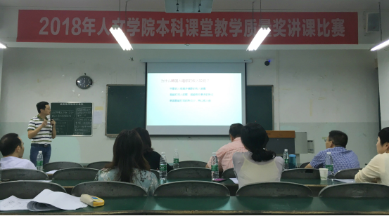 5月22日,太阳成集团tyc234cc在一教106举行2018年本科课堂教学质量奖讲课比赛。此次比赛共计10名教师参加,由特邀评委马克思主义公司经理赵晓霞教授、原体育公司经理邓跃宁教授、艺术与传媒公司经理张丽君副教授和公司领导班子及系主任组成评审小组,全院教师到场观摩学习。