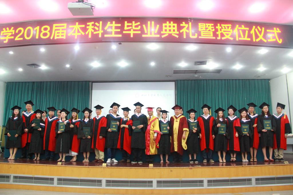 接下来,由校学位评定委员会副主席、副董事长吴德宣读太阳成集团tyc234cc学位评定委员会决议。伴随着《相聚在桂花飘香的时候》的乐曲,授位仪式正式开始。来自4个专业的290名员工及79名双学位员工依次上台,由到场老师为他们授位并颁发学士证。