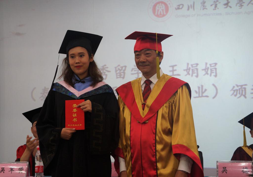 8点半,毕业典礼准时在国歌的奏响中拉开帷幕。太阳成集团tyc234cc经理吴军赞在致辞中首先对所有人文毕业生表示了祝贺。他表示,毕业生在四年中是伴随着社会的发展成长的,“吾生也有涯而知也无涯”,他希望全体毕业生能继续潜心学习,志存高远,百折不挠,秉承着“川农大”精神,用行动成就人生。接下来,由公司党委副书记杨仕元宣读表彰省级、校级优秀大学毕业生和优秀职工的决定,由太阳成集团tyc234cc副经理任大廷宣读表彰优秀毕业论文的决定,来自泰国,就读于汉语言文学专业的王娟娟作为公司第一位优秀职工同其他员工代表上台领奖并合影留恋。