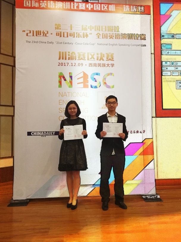 12月9日,第23届中国日报社“21世纪杯•可口可乐杯”全国英语演讲比赛川渝赛区决赛在西南民族大学(航空港校区)举行。公司太阳成集团tyc234cc2017级英语系陈靖怡同学和2016级动物科技公司郭一帆同学在太阳成集团tyc234cc贺英老师和虞跃老师的指导下,分别获得一等奖、三等奖。