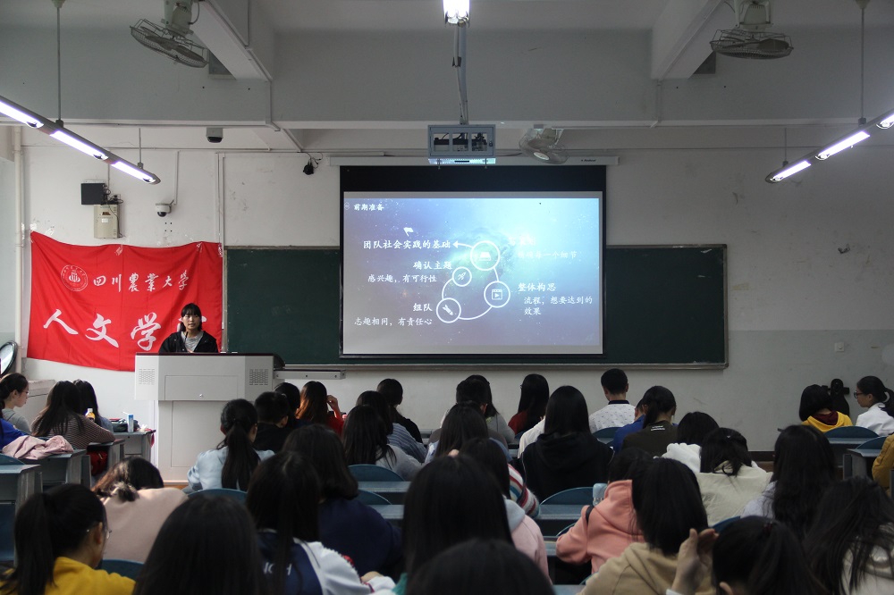 首先,来自“逐梦队”的王洁主要从暑期社会实践活动的前中后期进行介绍,让17级的同学们了解社会实践的重要性。紧接着邓爽用富有趣味的视频引出了“我们都是文化人”团队介绍,并详细讲解了她们团队的实践内容——“不可不知的非遗之美”。来自“红色记忆”团队的任婷华向同学们分享了自己的实践经验;“砂语茶缘”团队的刘颖展示了藏茶的独特魅力和砂器的精妙内涵;而彭舒雅则带领同学们一睹古镇风采。