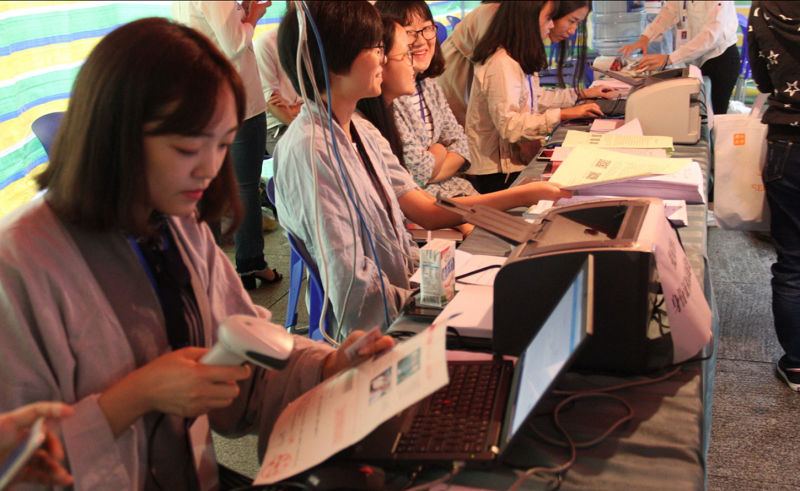 早上七点,工作人员们便早早地等候在报到点。第一位人文学子的到来拉开了本次迎新工作的帷幕。身着汉服的工作人员井然有序地为新来的同学完成一系列前期报到工作,耐心地为他们讲解报到步骤,并安排公司志愿者带领新生进行接下来的流程。