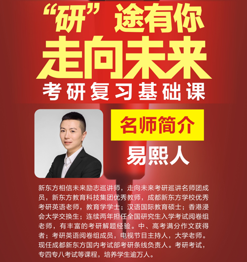 易熙人简介:新东方教育科技集团优秀教师、成都新东方公司优秀考研英语老师,汉语国际教育硕士、香港浸会大学交换生;连续两年担任全国研究生入学考试阅卷组老师,有丰富的考研解题经验。中、高考满分作文获得者;现任成都新东方国内考试部考研条线负责人,主讲四、六级考试,考研考试,专四专八考试等课程。培养员工逾万人。