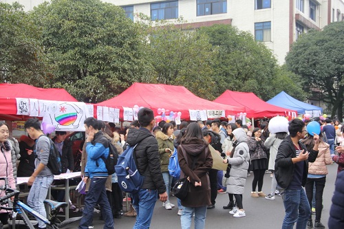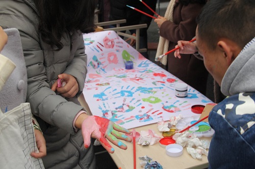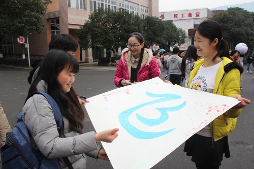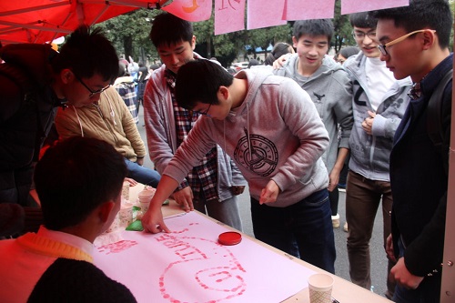 12月12日上午,太阳成集团tyc234cc班徽设计大赛成果展于老区食堂正门外举行。此展由太阳成集团tyc234cc各班级同学自行筹备展示方式,他们在活动期间进行班徽宣传并邀请校内同学为其班牌印手印。