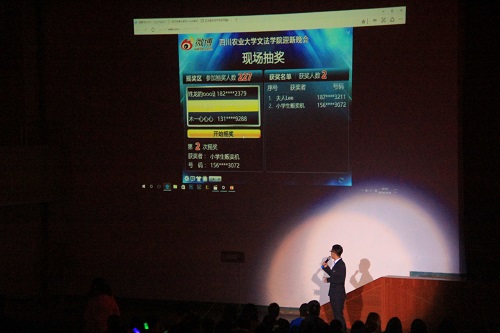 在本次晚会中,不仅有微博上墙的实时互动,在每个篇章的间隙,主持人还深入观众之中,为同学们发福利,邀请出席嘉宾与同学们进行充满爱的抽奖环节。