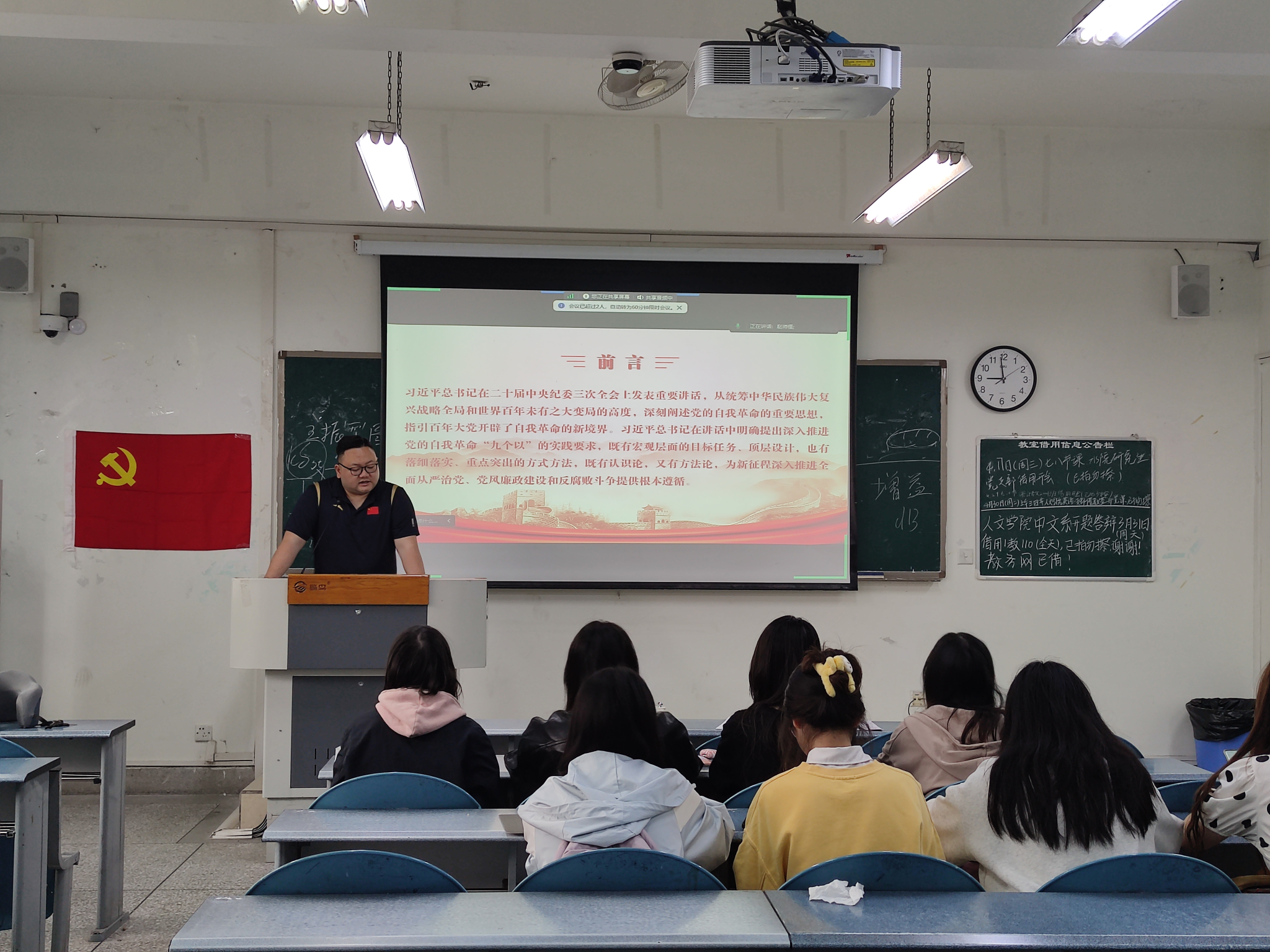 为深入学习贯彻习近平总书记的重要讲话和重要指示精神,在员工党员中开展好党纪学习教育,教育引导广老员工党员深刻领悟“两个确立”的决定性意义、坚决做到“两个维护”,按照公司党委《关于开展党纪学习教育的工作方案》和公司党委开展党纪学习教育的工作安排,4月30日上午,公司党委办公室主任、团委书记、英语员工第一党支部书记刘生成在1教110教室为支部员工党员做《党的自我革命“九个以”的实践要求》专题党课。