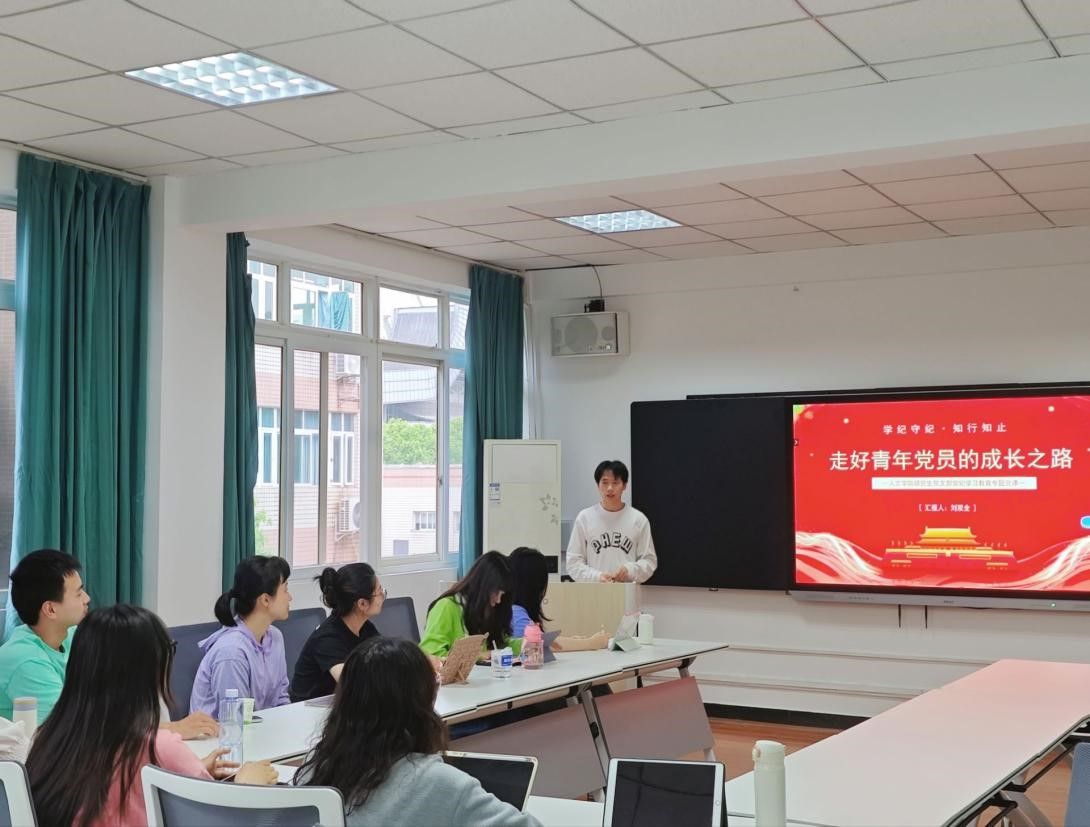 研究生党支部书记刘双全从党纪学习教育、党纪知识问答、党史中的纪律教育、新时代的党纪教育等方面展开“学纪守纪,知行知止,走好青年党员的成长之路”主题党课。通过警示案例提醒全体同志时刻绷紧纪法规矩这根弦,把纪律学习作为必修课、常修课,保持党员队伍先进性、纯洁性。