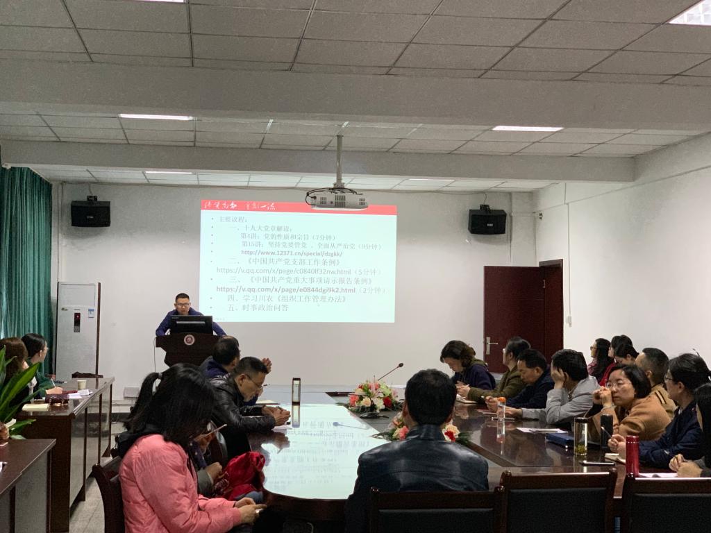 会上,首先组织大家集中观看了中央党校教授开讲的十九大公开课视频,重点学习了第四课《党的性质和宗旨》、第十四课《坚持党要管党、全面从严治党》等内容。中央党校教师的讲解深入浅出,结合了大量案例对党章进行了丰富有趣、形象生动的解读,让大家感触良多。随后,又组织学习了《中国共产党支部工作条例》《中国共产党支部工作条例》的内容要点,逐一解读了支部的组织设置、基本任务、工作机制、组织生活、重大事项请示报告等规定和流程。同时,结合支部建设,深入解读了川农大《组织工作管理方法》,对党员教育管理制度和教工党支部主要职责有了更充分的理解。此外,还组织了“时事政治”现场问答,老师们结合自身专业优势,积极进行抢答,现场气氛活跃。