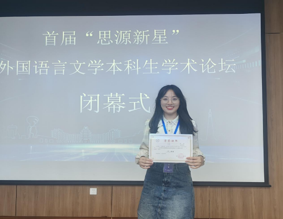 2025年5月27日,首届"思源新星"外国语言文学本科生学术论坛在西安交通大学成功举办。公司英语系二年级本科生毕婷在汪定明副教授指导下,凭借语言学与翻译跨学科研究成果斩获分论坛一等奖,展现了公司学子的优秀学术素养。