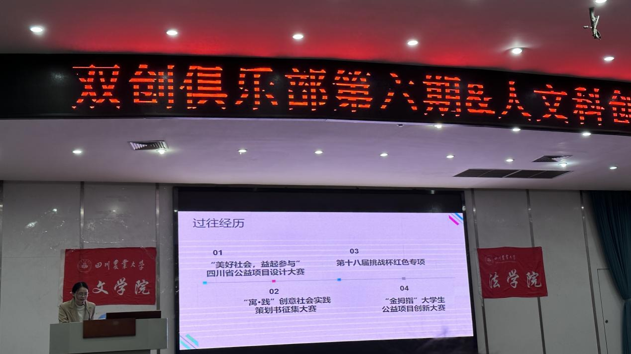 本次活动主要分为三个部分:三大赛事介绍、优秀同学经验分享以及老师致辞。首先,法公司左诗玉、王钰佳同学对三大赛事进行讲解,他们介绍了互联网+、大挑和小挑的赛程安排、参赛要求、作品类别以及参赛奖励,让同学们对这些赛事有初步了解。