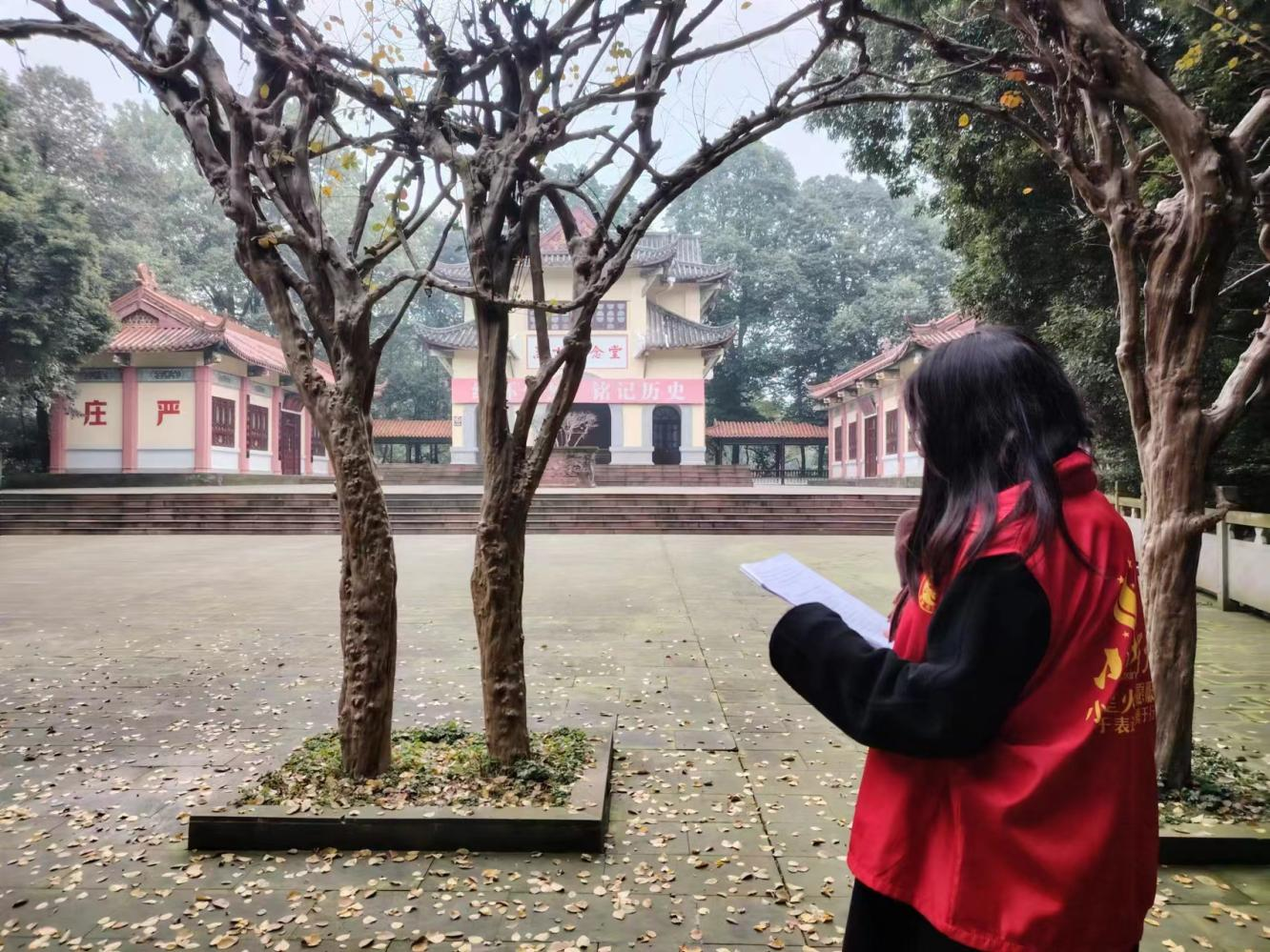 随后,同学们来到了岗家山七烈士雕塑前。何瑶对雅安解放历史进行讲解,使同学们了解到那段峥嵘岁月。雅安七烈士的英勇形象在讲解员生动的描述下变得更加鲜活,他们英勇无畏、舍生忘死、坚韧不拔,把自己的青春岁月奉献给革命事业,以生命诠释大无畏精神。在场同学都被先烈们的伟大革命精神深深打动。