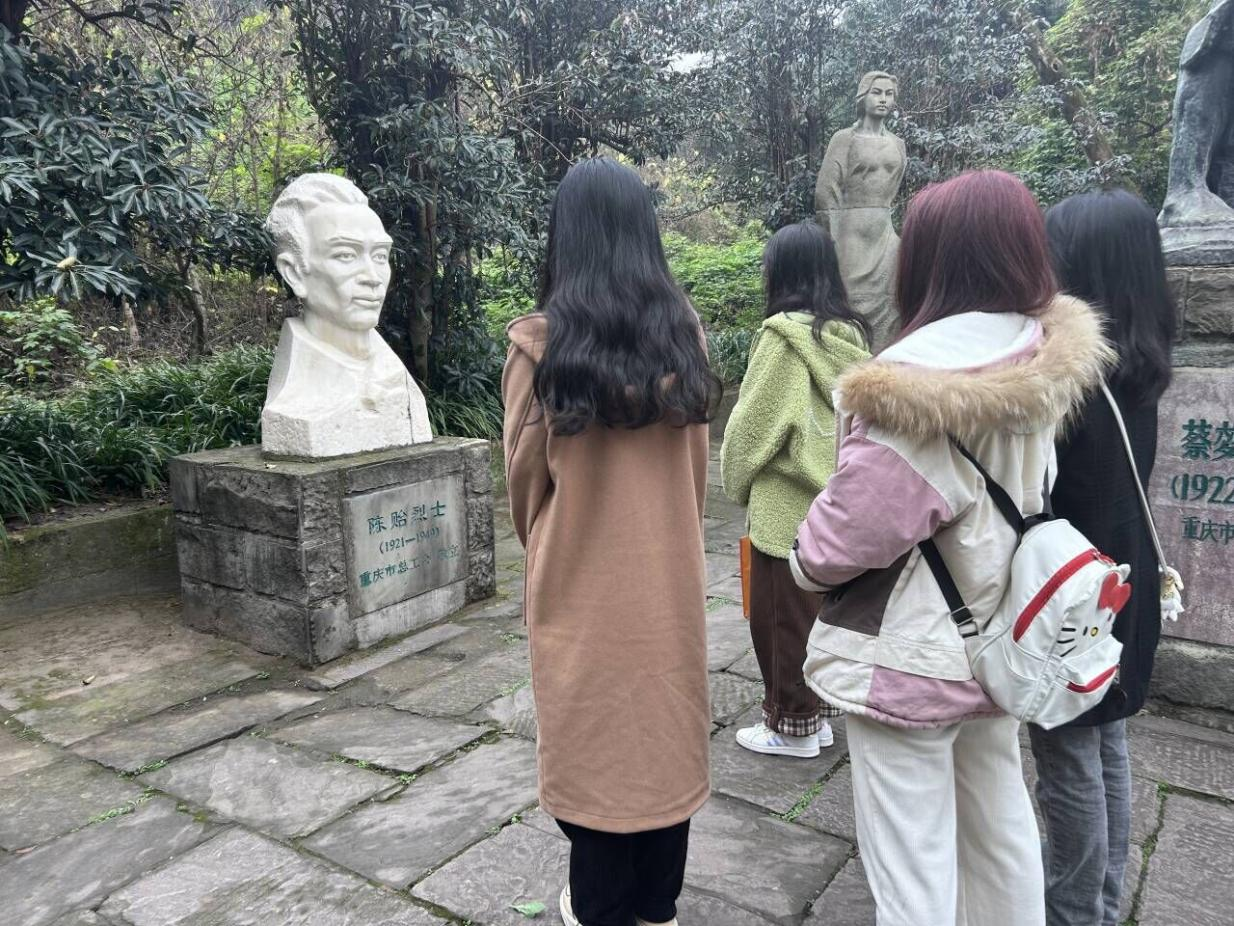 14:00,实践团队前往白公馆进行参观学习。团队成员观摩革命先烈们的雕塑,一齐朝烈士雕塑鞠躬以表敬意。白公馆别名“香山别墅”,亦是小说《红岩》中的重要原型地之一。1939年国民政府军统局将其改设为重庆临时看守所。天地英雄气,千秋尚凛然。这次白公馆之行让队员们意识到唯有崇尚英雄,缅怀先烈,传承英烈精神,砥砺家国情怀,中国人民才能同心同德,凝聚力量,不懈奋斗,永远前进。